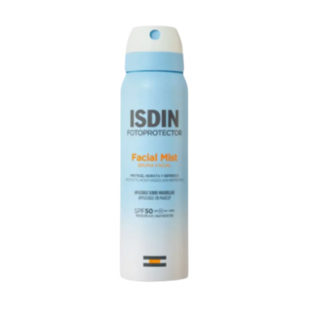 ISDIN Facial Mist SPF50 es una bruma fotoprotectora facial en formato spray diseñada para ofrecer protección solar muy alta (SPF50) con una textura ultraligera e invisible. Permite reaplicar la protección solar de forma rápida y cómoda incluso sobre el maquillaje, aportando frescor e hidratación sin dejar residuos ni sensación grasa.