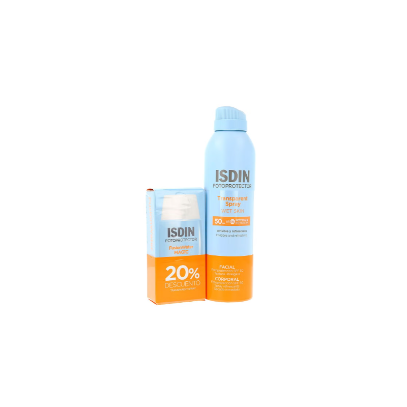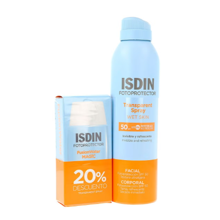 ISDIN Pack Fusion Water Magic 50 ml + Transparent Spray 250 ml es una solución completa para la protección solar.