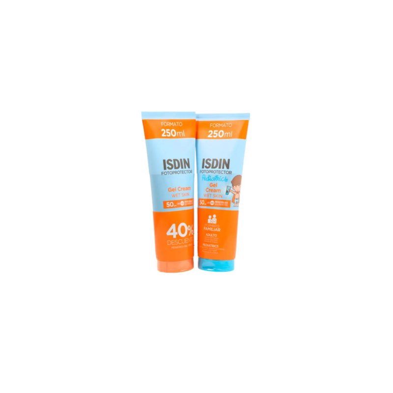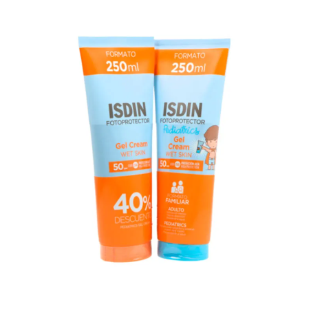Contiene : 1 unidad Fotoprotector Isidin Gel Crema 50+ 250ml + Fotoprotector Isdin Pediatrics Gel Crema 50+ 250ml.