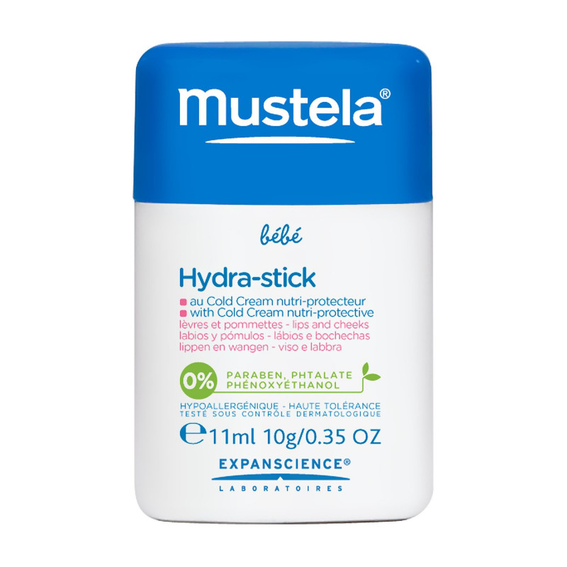 Hydra Stick Cold Cream de Mustela, protege y cuida las partes más sensibles de la cara de tu bebé, expuestas a las agresiones externas, como el frío, el viento. Ideal para proteger y nutrir pómulos, labios, nariz y los nudillos de las manos.
