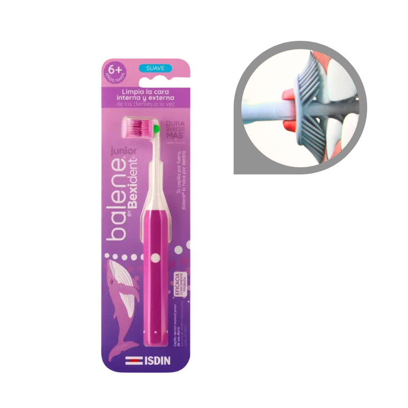 Balene by Bexident Junior Cepillo dental de uso diario que limpia la cara interna y externa de los dientes a la vez, eliminando la placa de forma eficaz y suave. Su innovador diseño incentiva la rutina del cepillado del niño gracias a su ergonomía y facilidad de uso.