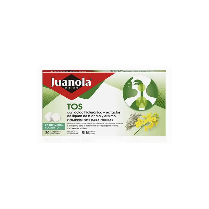 Juanola Tos Comprimidos es un producto sanitario que contiene ácido hialurónico y extractos de origen vegetal, como son el líquen de Islandia y el extracto de erísimo para aliviar la tos, la ronquera y el dolor de garganta.