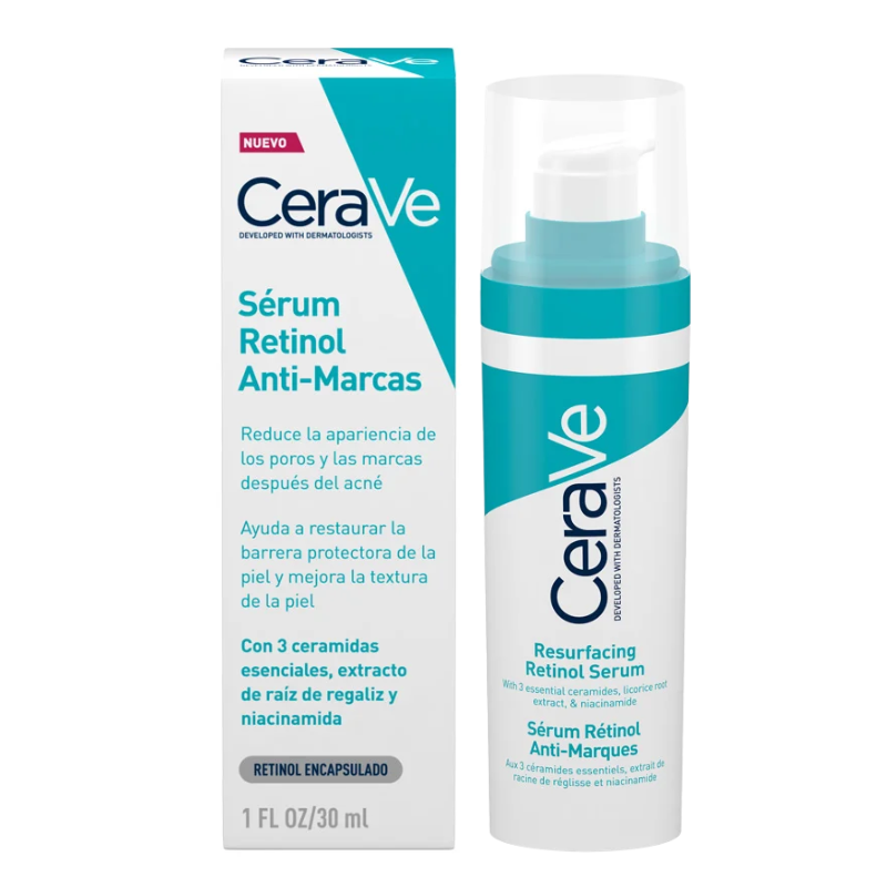 CeraVe Sérum Retinaol Anti-marcas, reduce la apariencia de los poros y las marcas después del acné, a la vez que restaura la barrera protectora de la piel y mejora la textura de la piel.