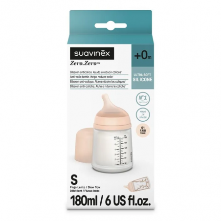 BIBERÓN SUAVINEX ZERO ZERO (a partir de 0 meses). Este biberón de Suavinex anticólicos imita física y funcionalmente el pecho materno evitando la ingesta de aire durante las tomas. Apto para leche materna y leche artificial, zumos y papillas muy líquidas. Tono Faire.