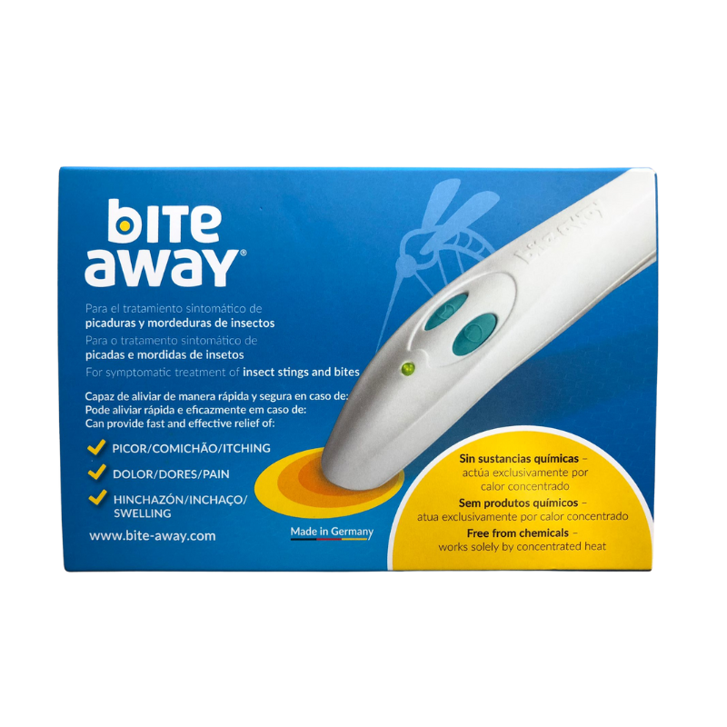 Bite Away es la solución instantánea para tratar los síntomas de las picaduras y mordeduras de insectos. Sin sustancias químicas, Bite Away aplica calor localizado sobre la picadura y en pocos segundos alivia eficazmente el picor, el dolor y la hinchazón.