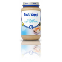 Nutriben potito con suprema de merluza, guisantes y zanahorias. Aceite de oliva 100% virgen extra, sin aceite de palma, boca más ancha y etiqueta transparente.
